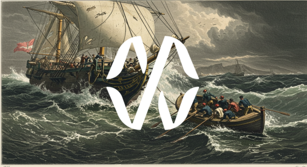 Rowboat with People in Rough Seas Near a Larger Ship